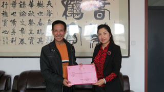 學(xué)院黨委副書記、紀(jì)委書記白托婭(右)向特邀黨建組織員白文生(左)同志頒發(fā)聘書 |
