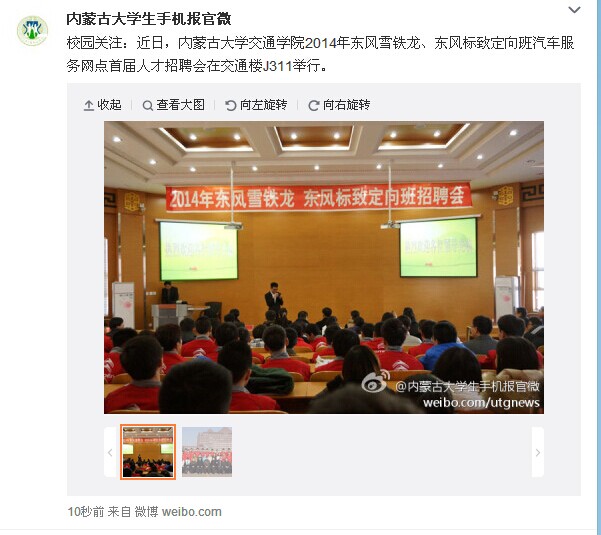 內(nèi)蒙古大學(xué)生手機(jī)報(bào)官微:交通學(xué)院成功舉辦2014年“東風(fēng)雪鐵龍”、“東風(fēng)標(biāo)致”首屆定向班汽車服務(wù)網(wǎng)點(diǎn)