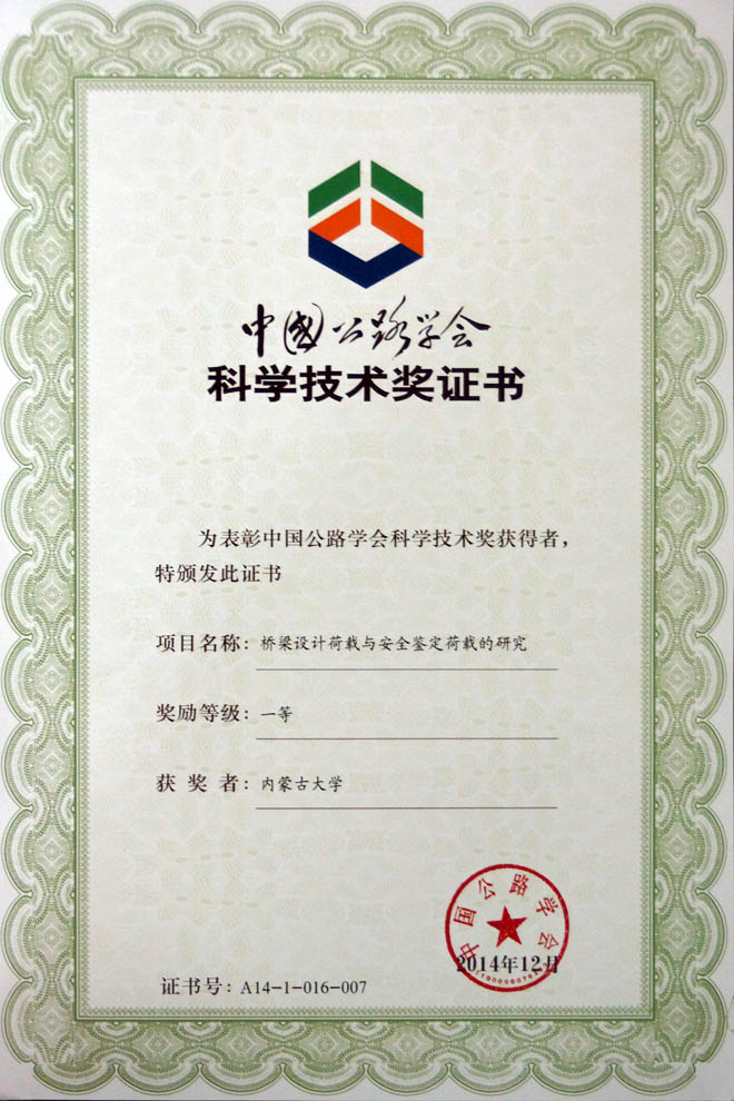 由我院教師王智遠(yuǎn)、張春梅、李艷麗、張大偉參與研究的交通運(yùn)輸部西部交通科技項(xiàng)目《橋梁設(shè)計(jì)荷載與安全鑒定荷載的研究》獲得了2014年度中國(guó)公路學(xué)會(huì)科學(xué)技術(shù)一等獎(jiǎng)。該獎(jiǎng)項(xiàng)每年評(píng)選一次,我院主要承擔(dān)的是該課題的子課題之一《典型運(yùn)煤公路橋梁---包頭黃河公路大橋荷載特征研究》。
